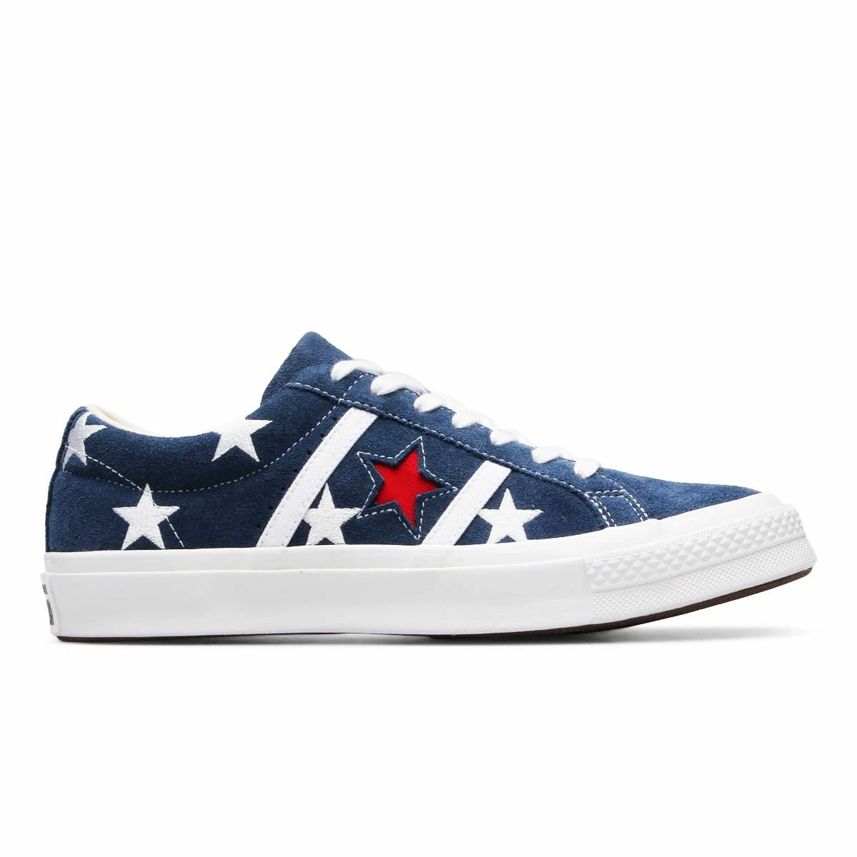 When it originally released during the 70s, the One Star Academy silhouette was actually envisioned as an update of the classic All Star model. With the beginning of summer, and July 4th celebrations looming, the Academy Ox presents its own take on the classic, American flag Chuck. The star/stripe branding of the Academy is a natural launching point for the red, white and blue, star spangled colorway.Â