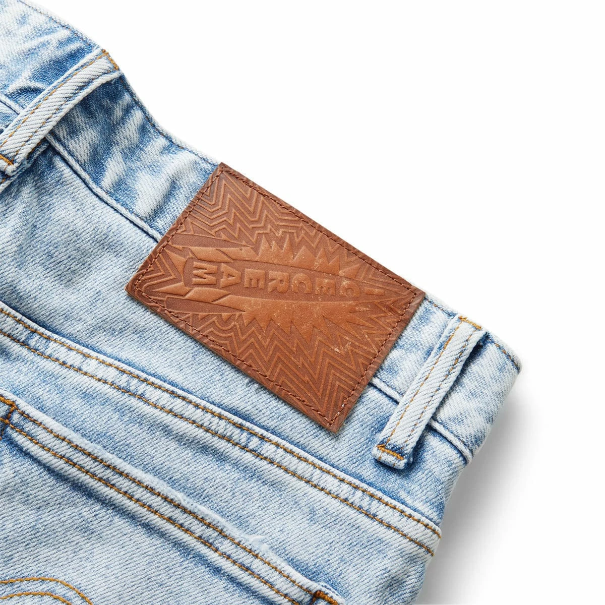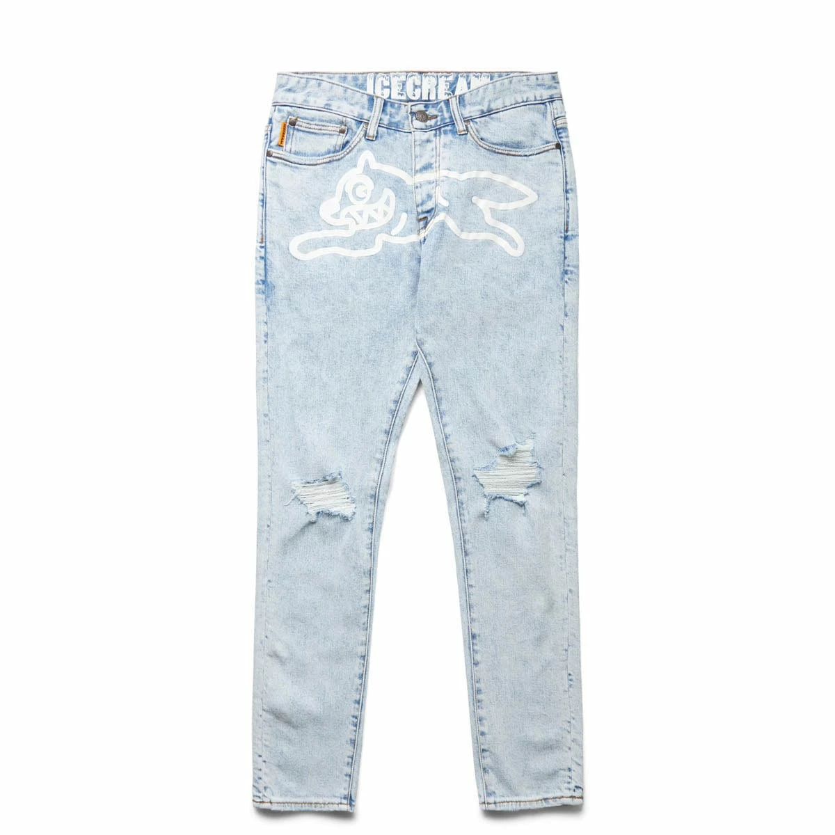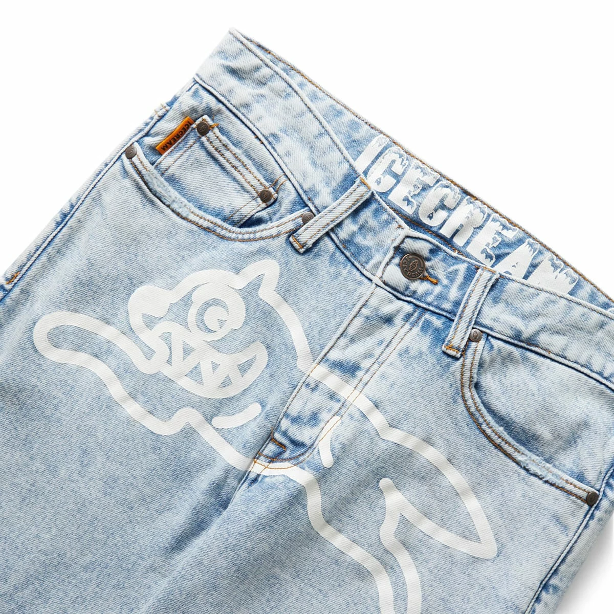 Baby-blue jeans boasting a Running Dog graphic and distressing at the knees by ICECREAM.
