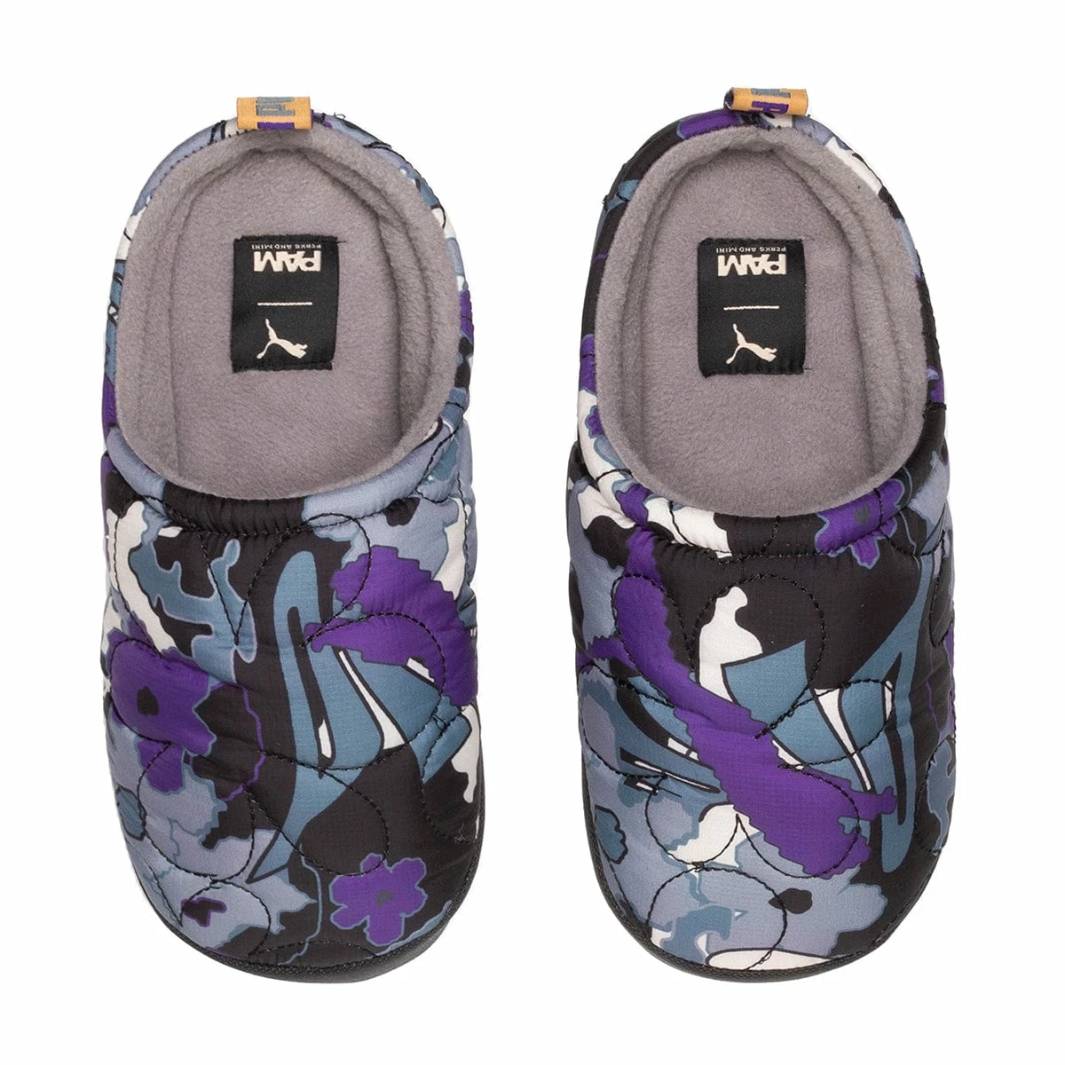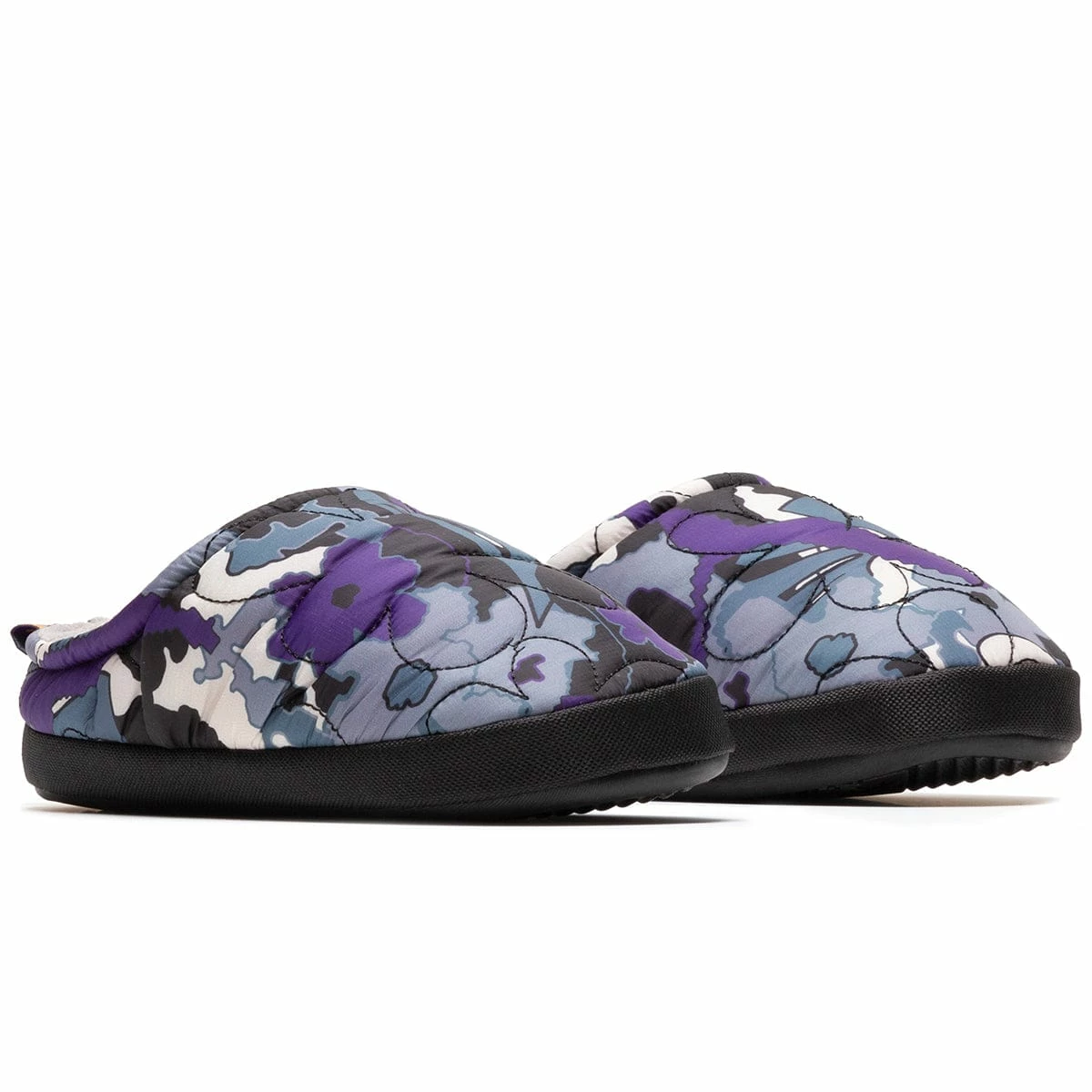 The Puffy Sandal with a trippy flower camo blend indoor and outdoor comfort, evident by the fleece insulation and quilted upper telling you to stay home all day but a sole substantial enough for the reluctant excursion out.Â